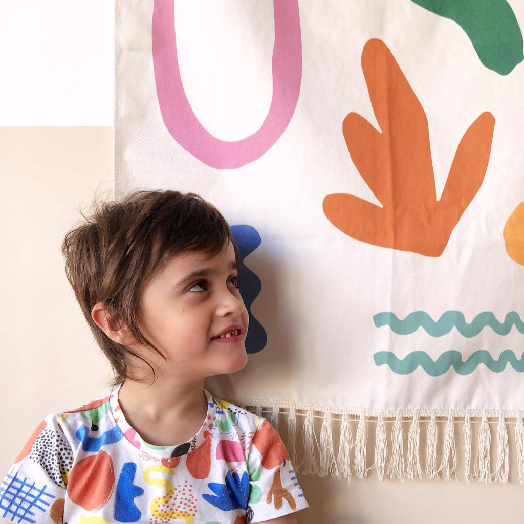 Tapiz de pared con dibujos geométicos y abstractos, ilustrado con una paleta de colores cálida y simpre que lo hacen una opción deco súper canchera para los más chicos.